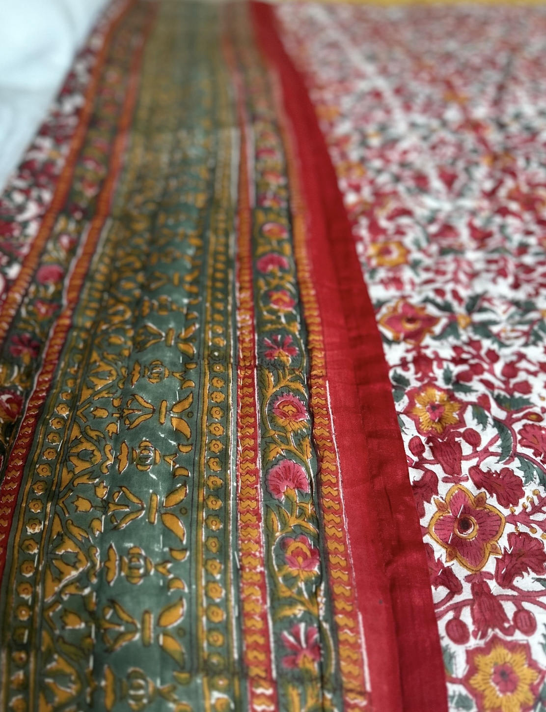 A beautiful floral red design, all over patterned screen printed bedspread. The quilt is reversible with one side having more white. This gorgeous bedspread will add something special to your room.