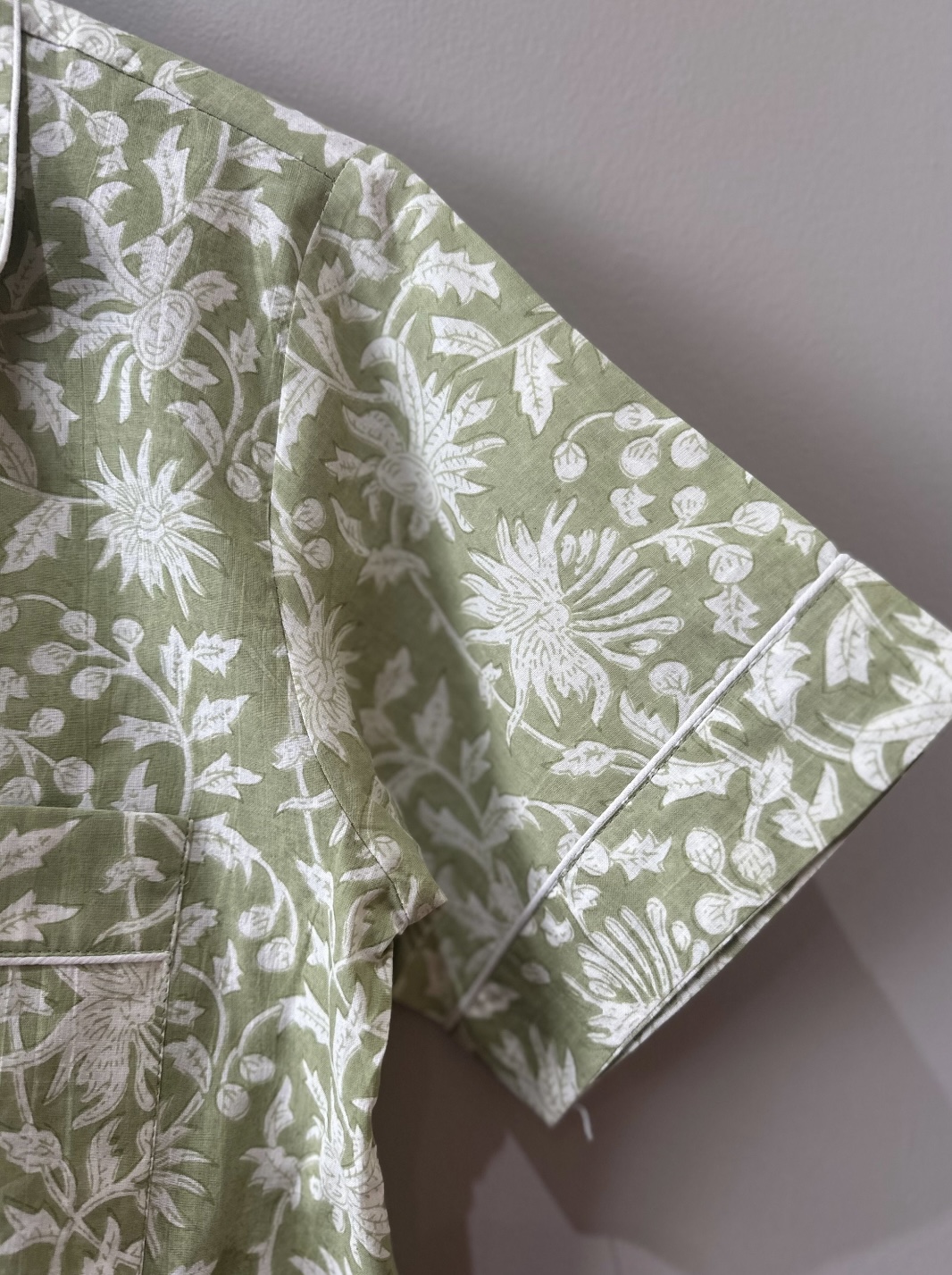The soft cotton fabric is hand block printed in India using traditional methods. Each set is hand made with love and care.