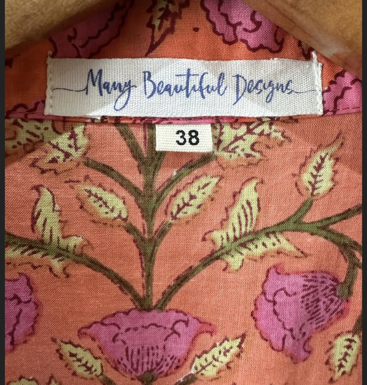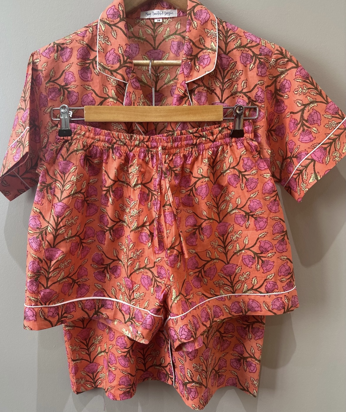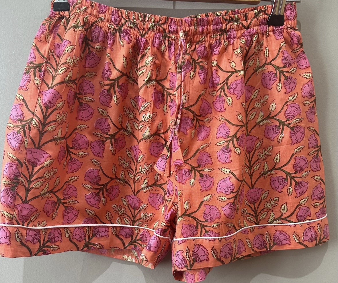 The soft cotton fabric is hand block printed in India using traditional methods. Each set is hand made with love and care.