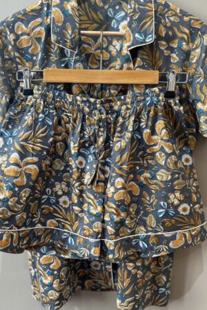 Blue Floral Ladies Cotton Block Printed Pyjama Set